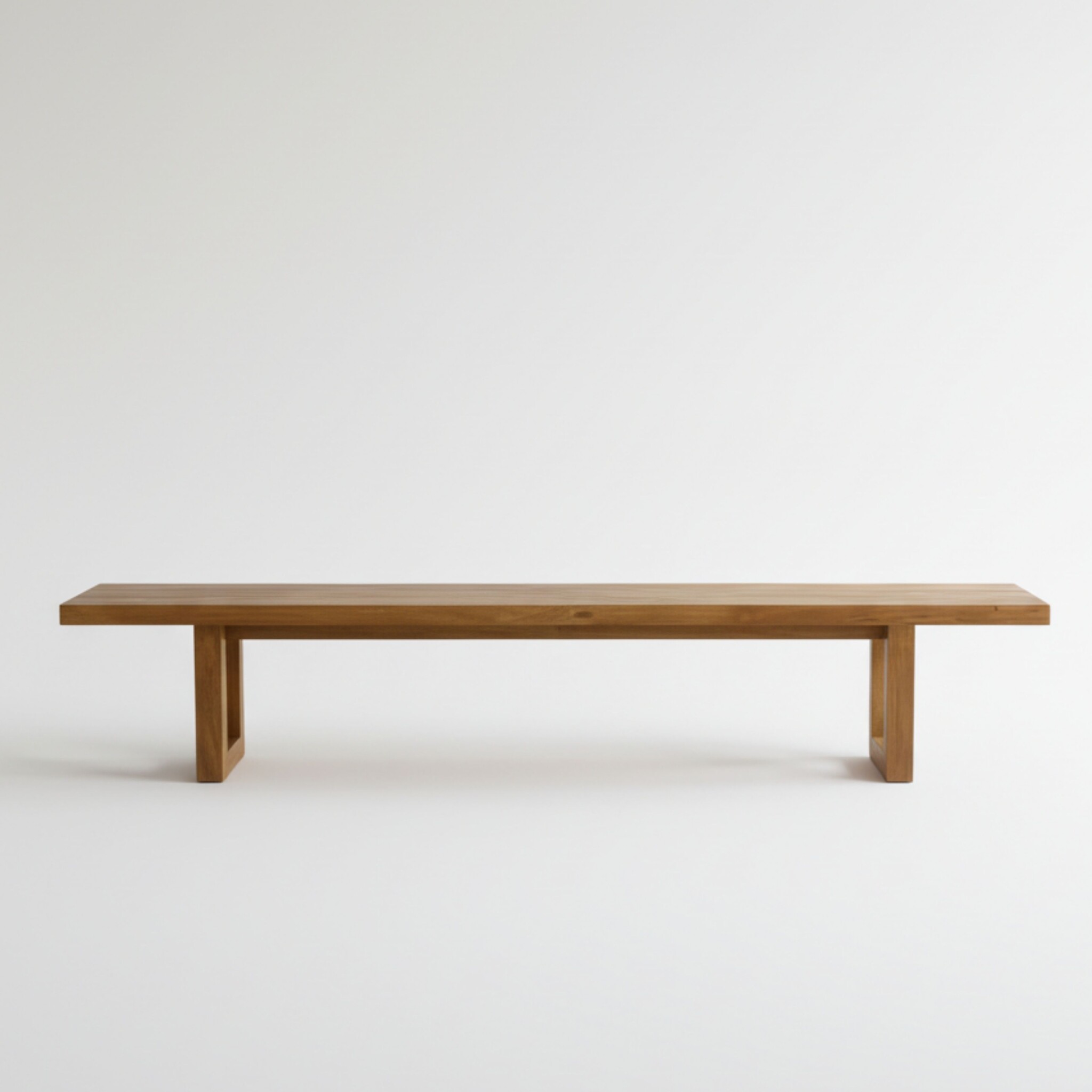 Diese lange Holzbank verleiht jedem Raum Ruhe und Charakter dank ihrer klaren Form und natürlichen Oberfläche. Mit breiter Sitzfläche und quadratischen Blockfüßen wirkt sie stabil, aber schlicht – perfekt für große Flure, Gartenpatios oder das Fußende eines Bettes.