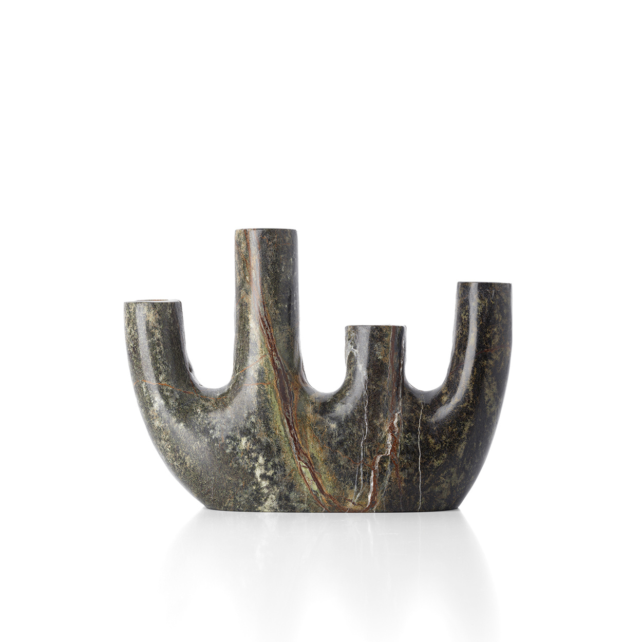Ihre geschwungene Silhouette wirkt sowohl architektonisch als auch fließend und vermittelt eine subtile, ausdrucksstarke Präsenz. Grüntöne ziehen sich über die Oberfläche, durchzogen von erdigen und elfenbeinfarbenen Adern. Kompakt und vielseitig ergänzt sie minimalistische Blumenarrangements oder steht allein als eleganter Akzent.