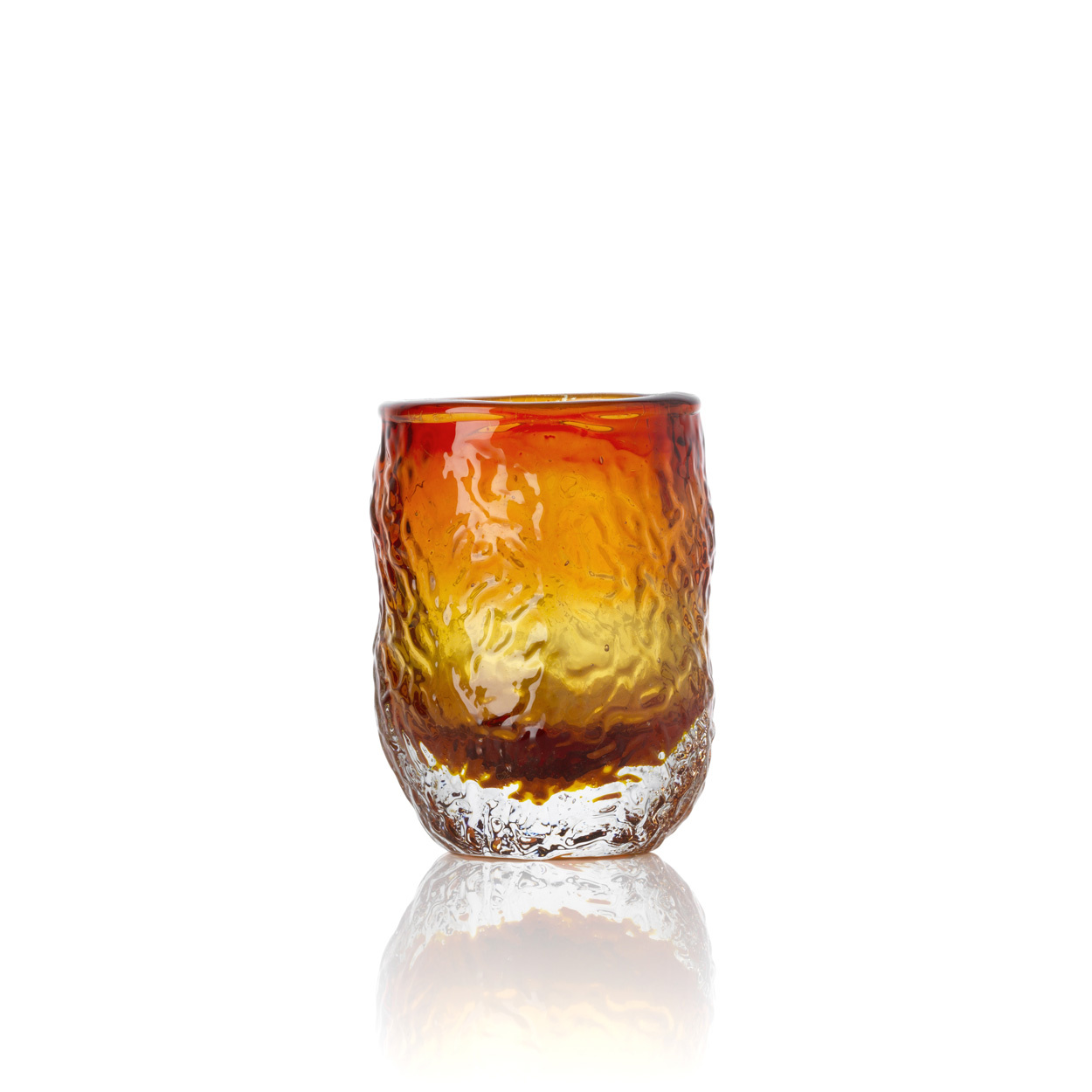 Das Marbella Glow Tumbler Glas strahlt goldene Wärme aus. Dieses bernsteinfarbene Glas wurde durch geschmolzene Handwerkskunst und sanfte Unregelmäßigkeiten geformt. Die wellenförmige Oberfläche fängt das Licht ein und streut es sanft in alle Richtungen.