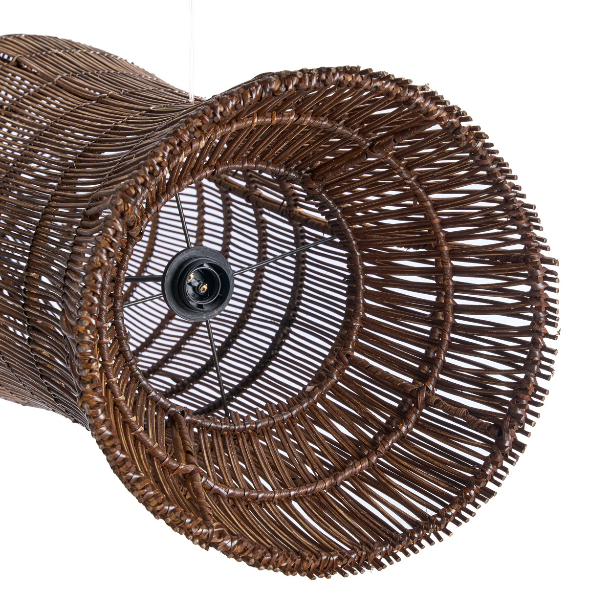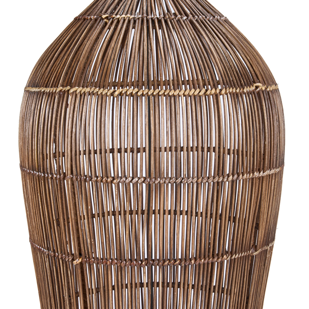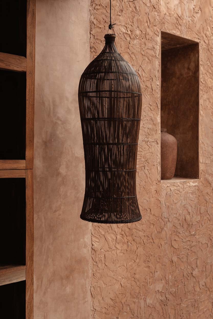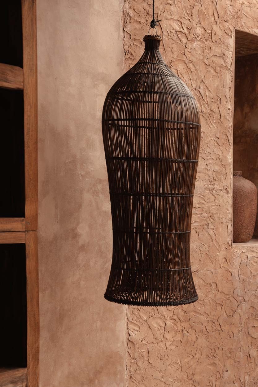 Eine hohe Rattan-Hängeleuchte, die mit ihrer skulpturalen Präsenz und warmen Erdtönen handwerkliche Eleganz in luftige Räume bringt.