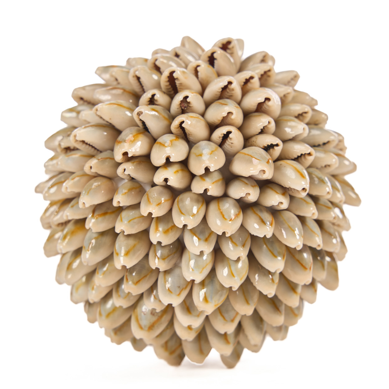 Each mini decorative shell sphere reveals nuanced tones and shapes, formed through precise shell placement that preserves the depth and character of its artisanal craftsmanship.