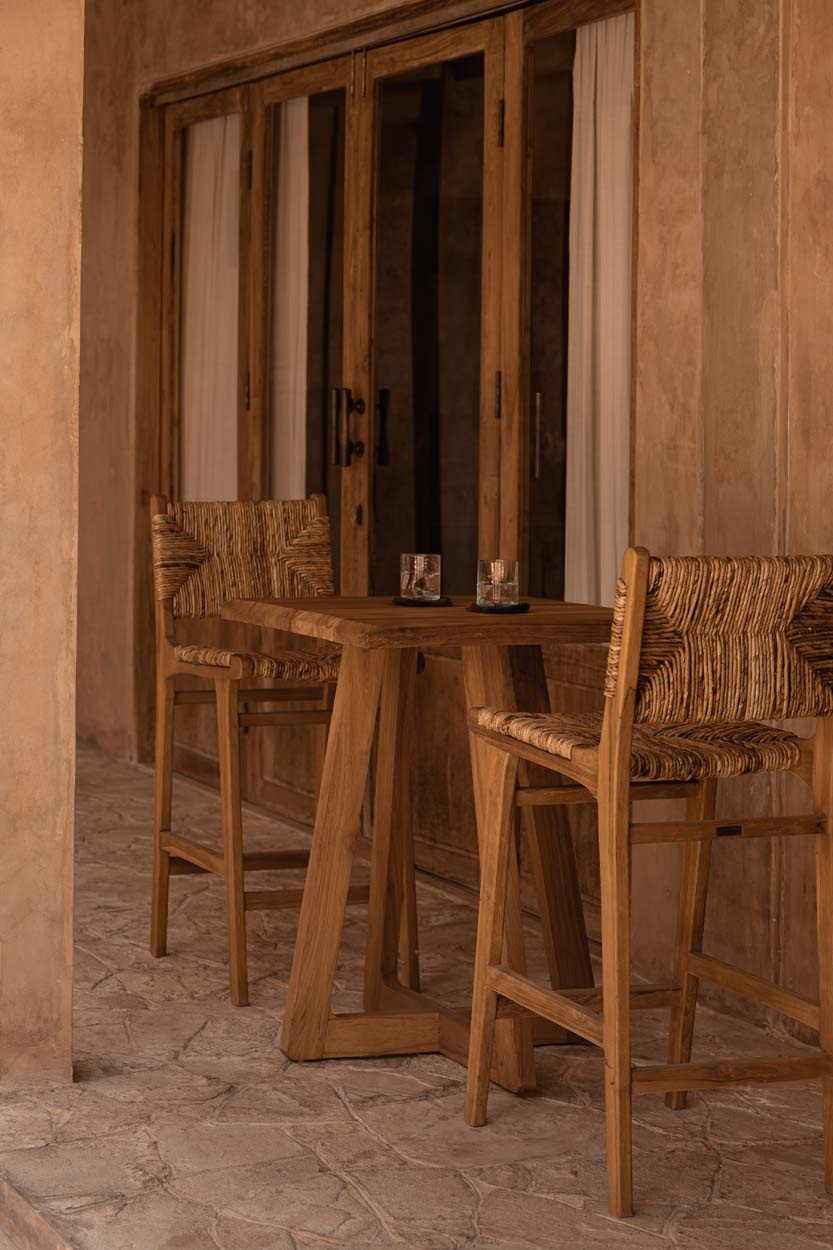 Compact yet elevated, the tall wooden table lends itself to relaxed gatherings, quiet breakfasts, or an intimate evening drink. Its clean silhouette highlights the subtle warmth of teak wood, while the open base offers a sense of lightness and space. The design’s simplicity brings calm to any room it inhabits.