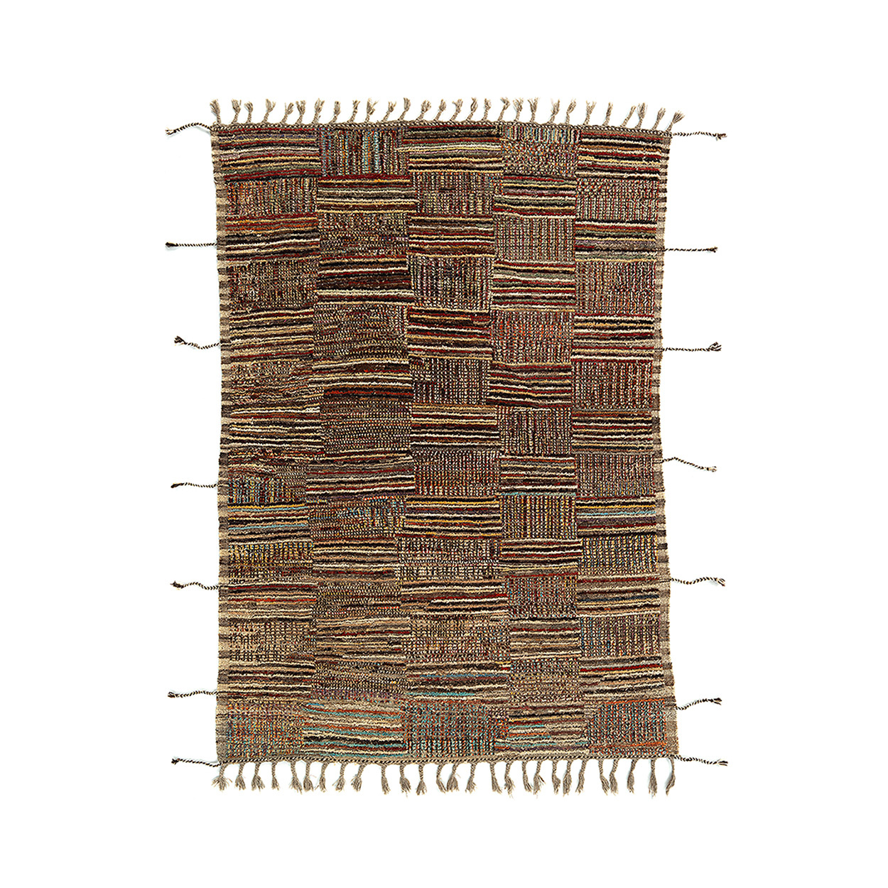 Wool fibers provide resilience and a soft underfoot feel, making it dependable for everyday living. At 290 × 209 cm, it fits comfortably beneath a dining table, anchors a lounge, or enhances a studio space with proportion and warmth. Earthy browns, muted reds, and subtle touches of blue lend the rug a character that complements rustic, eclectic, or modern interiors.