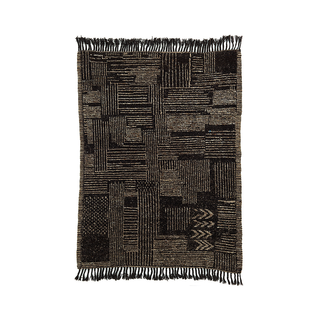 Wool fibers dyed with natural pigments bring both resilience and tactile softness, offering a surface that is durable yet comfortable underfoot. Its interplay of dark tones and intricate motifs gives the rug adaptability, complementing rustic wood, modern furniture, or eclectic blends with equal ease.