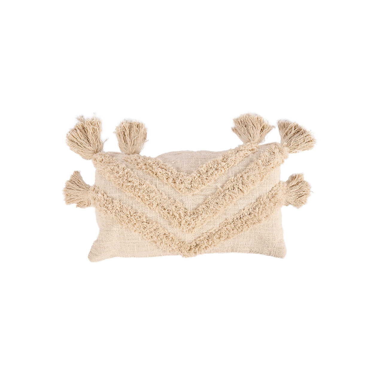 A cream cushion cover with tassels that brings effortless boho charm, blending texture and playfulness in a rectangular shape perfect for layering.