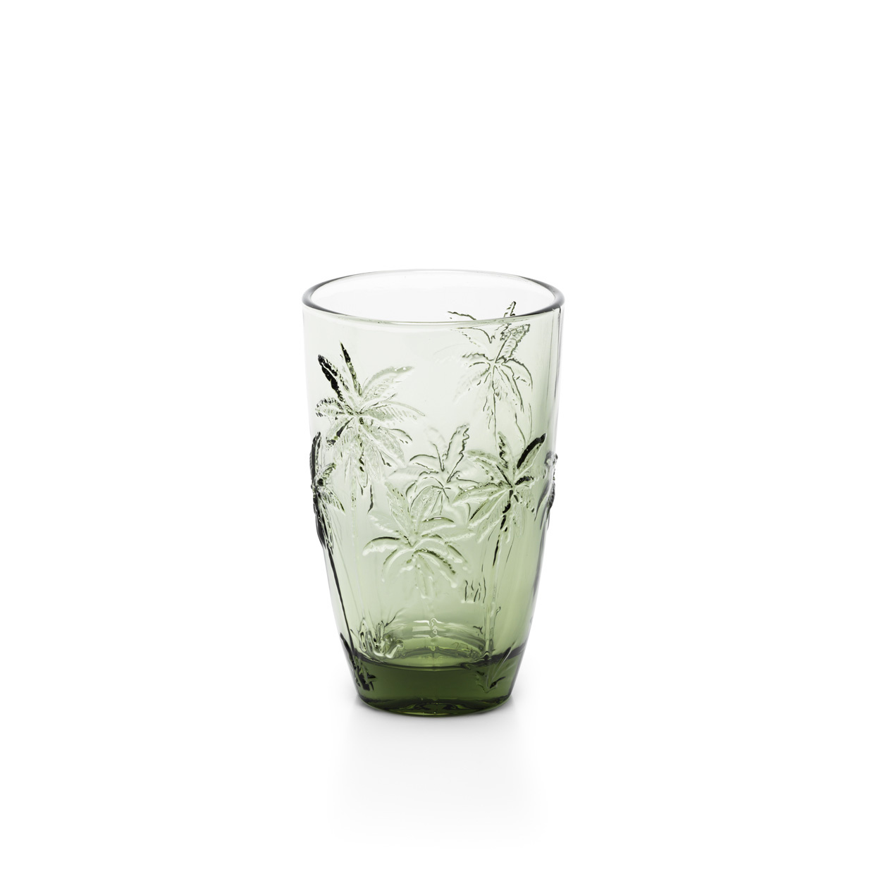 A tall green high ball glass etched with palm trees, blending tropical style with recycled glass craftsmanship for everyday drinks and gatherings.