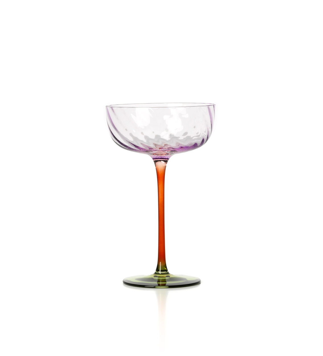 Elegant yet quietly playful, The Trio-Tone Coupe redefines the classic champagne coupe glass with a contemporary edge. Its long, slender stem flows from amber to green, while the bowl shimmers in a soft violet hue, creating a composition that feels both modern and timeless.