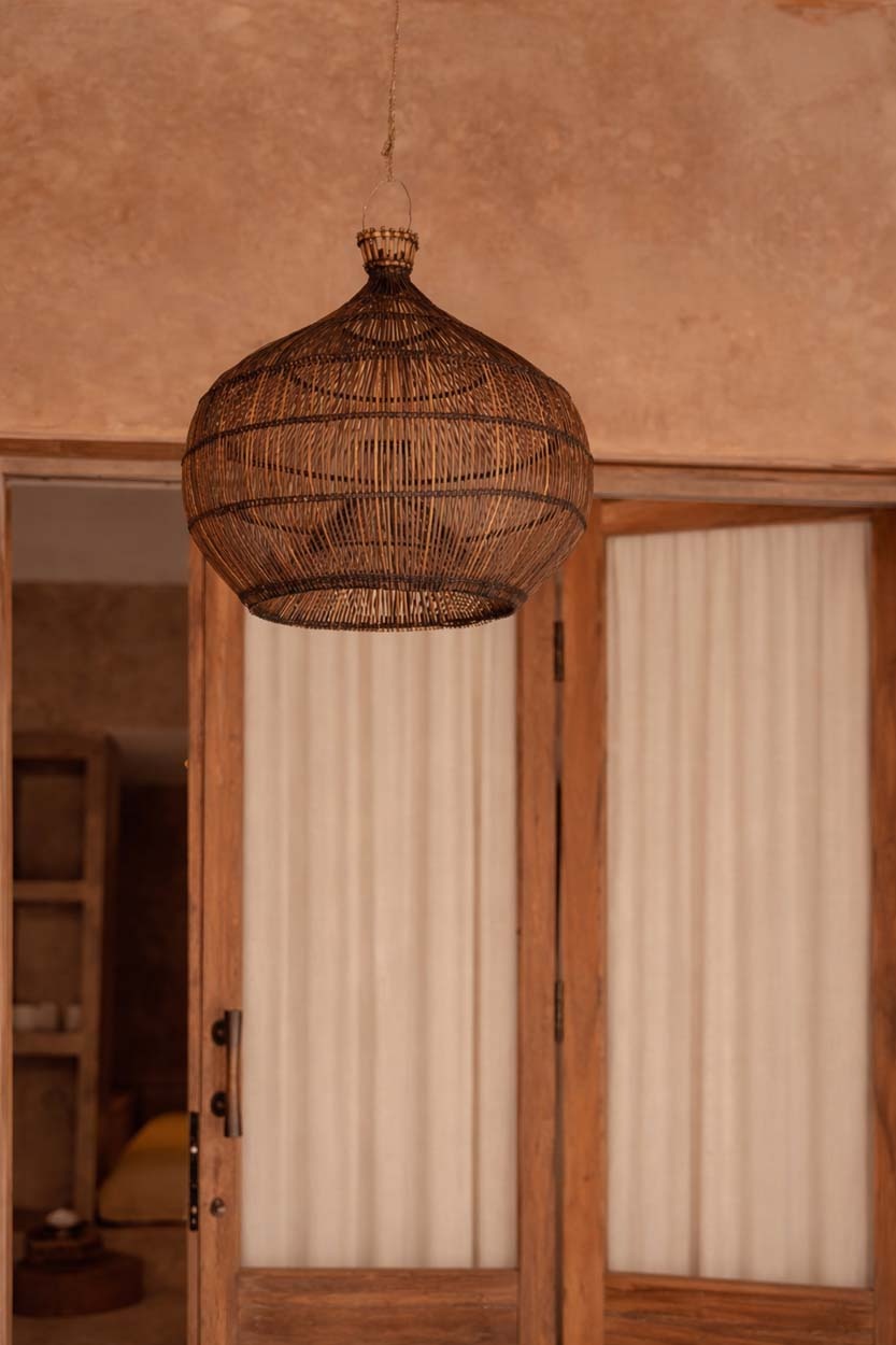 La lámpara colgante Desert Gourd está definida por una geometría suave. Como lámpara colgante pequeña de ratán, su forma redondeada y su delicado tejido aportan calidez al interior, creando una atmósfera serena. El tono nogal oscuro aporta profundidad y contraste natural con paletas claras o neutras.