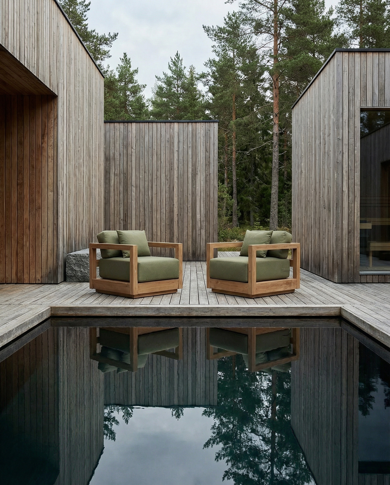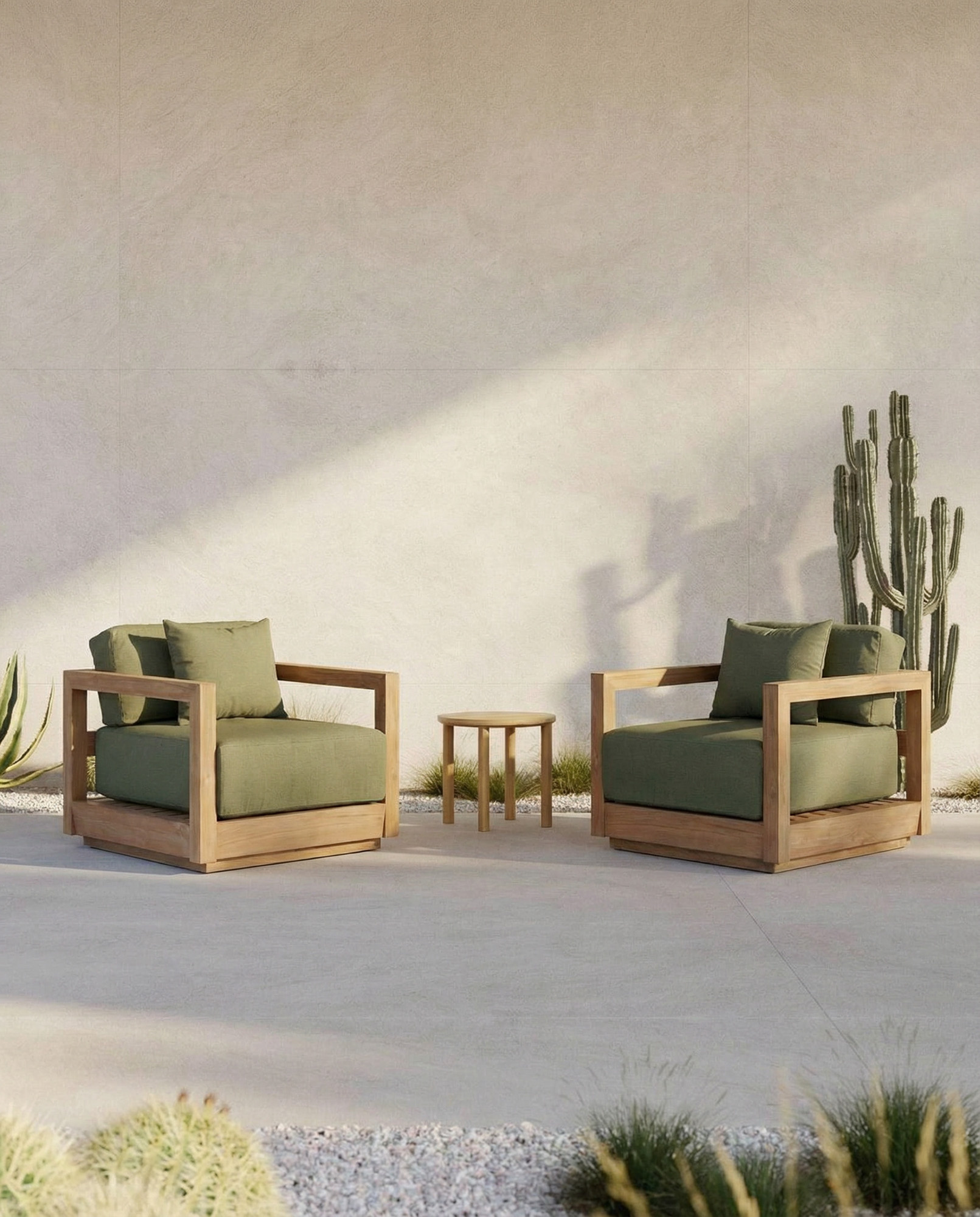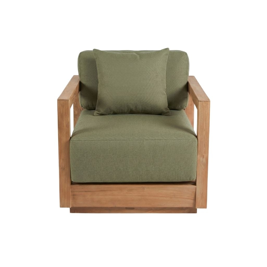 Le Umalas canapé une place présente un fauteuil d’extérieur avec coussins au caractère calme, structuré et discrètement présent sur terrasses, vérandas ou coins de jardin. Le cadre en teck recyclé apporte chaleur et rythme, tandis que la teinte vert Alga s’intègre naturellement dans l’environnement extérieur.