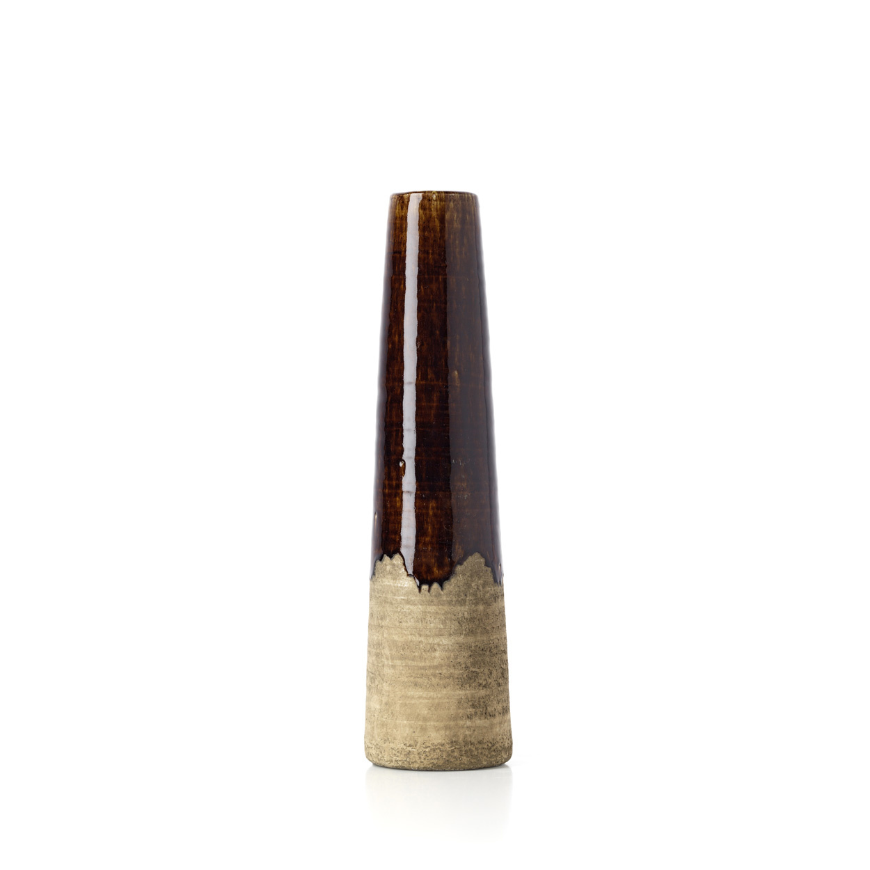 La forma conica allungata è versatile, adatta a spazi rustici e contemporanei. Il corpo in grès dona peso e durata, mentre la base stretta affina le proporzioni decise in una dichiarazione elegante. La tonalità marrone naturale aggiunge calore, esaltando il carattere di qualsiasi ambiente.