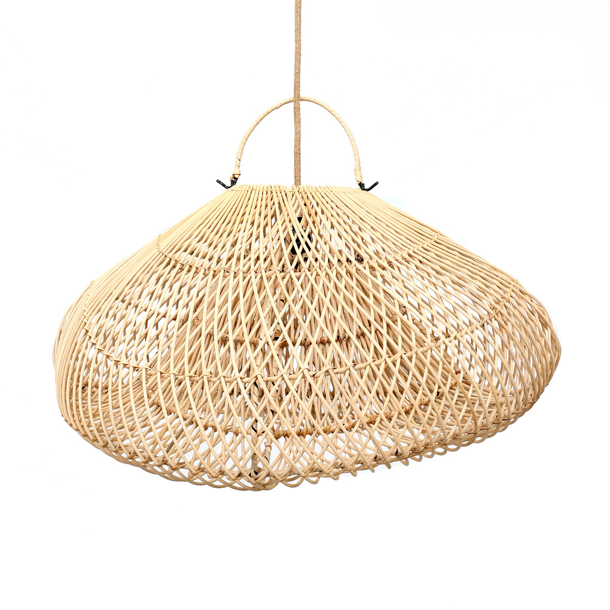 Progettata come una grande lampada in rattan naturale, la sua trama ariosa crea profondità scultorea mantenendo una leggerezza visiva. Perfetta per ambienti costieri, bohémien o moderni in cerca di calore artigianale ed eleganza naturale.