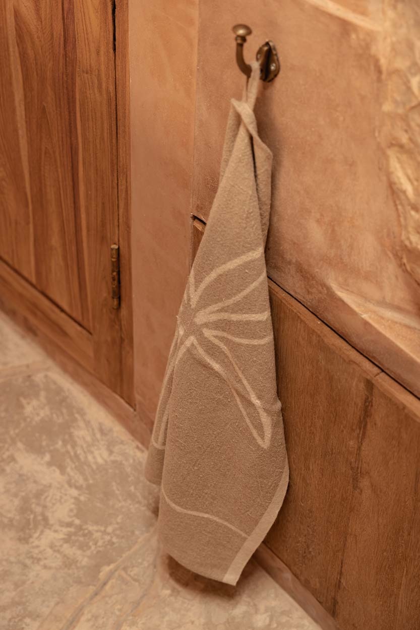 Utilizzato per asciugare le mani o appeso accanto al lavello, diventa parte del flusso quotidiano senza cercare attenzione. Il motivo a palma offre una pausa visiva delicata, evocando aria aperta e climi caldi, mentre il tono neutro si abbina naturalmente a ceramica, legno e pietra.