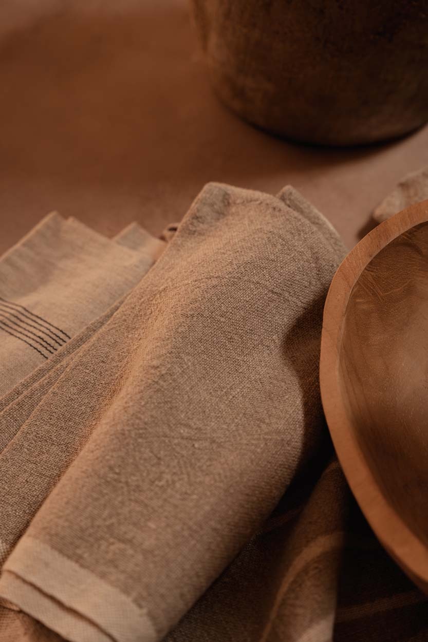 Pratico nell’uso, il lino si piega facilmente, cade con morbidezza e mantiene la forma quando appeso o impilato con altri canovacci chiari. Rifinito con cura, il materiale mostra lievi variazioni che riflettono la qualità tattile del lino e il processo attento di lavorazione.