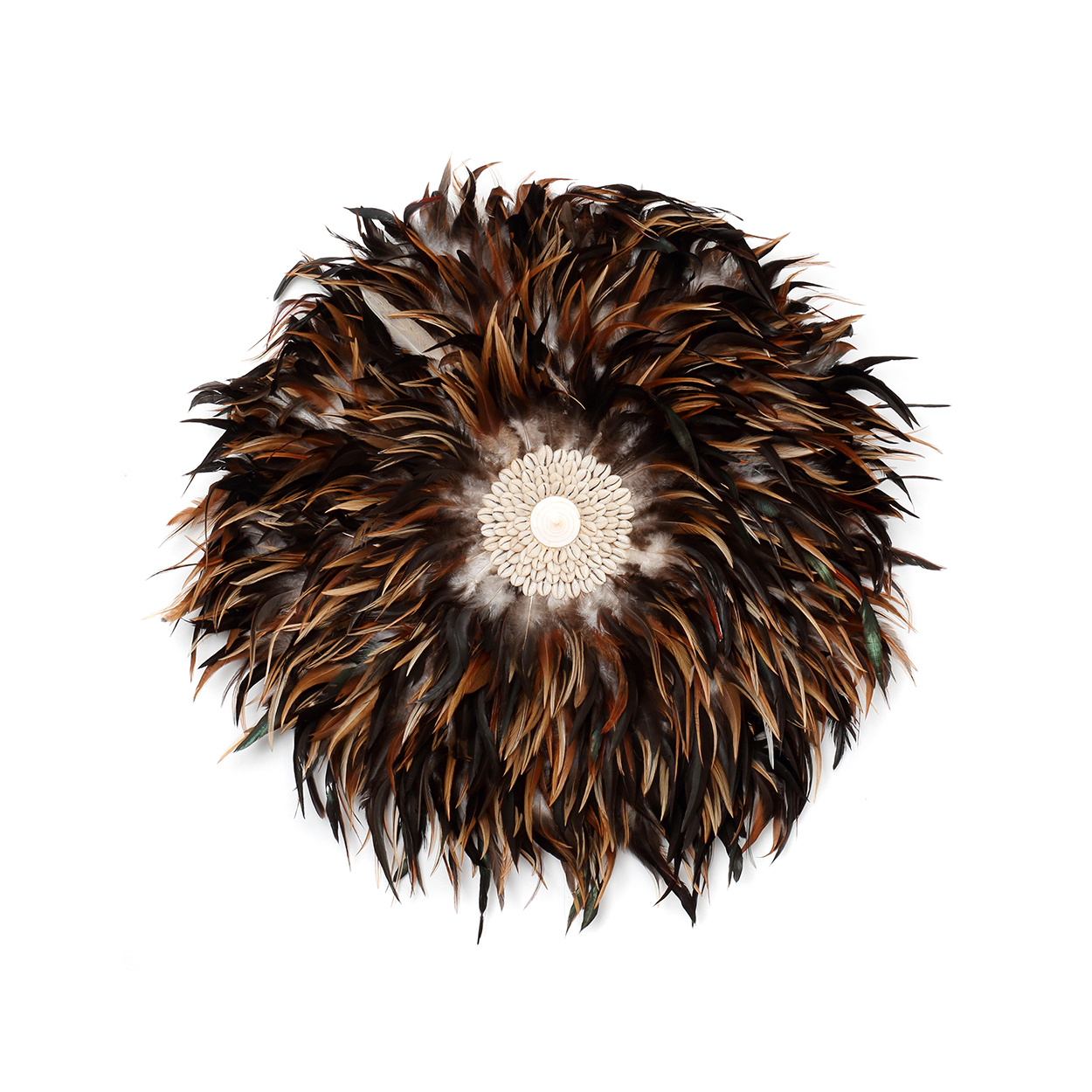 Productomschrijving Onze prachtige wanddecoratie met bruine veren is een echte bohemien schoonheid om elke muur in huis, op een overdekt terras of in de tuin te versieren. De middelste cirkel is omringd door handgeplaatste schelpen.