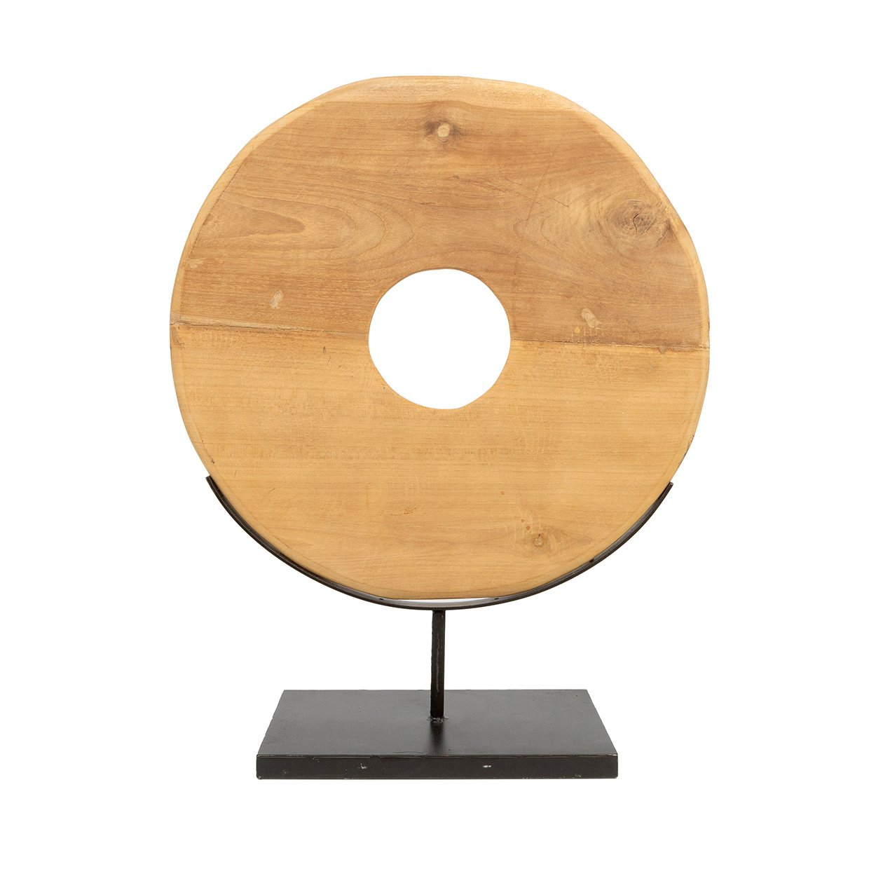 Voeg een vleugje natuurlijke elegantie toe met dit houten schijfbeeld op standaard. Met zijn ronde vorm en centrale uitsparing trekt dit stuk de aandacht met strakke lijnen en een minimalistische uitstraling.