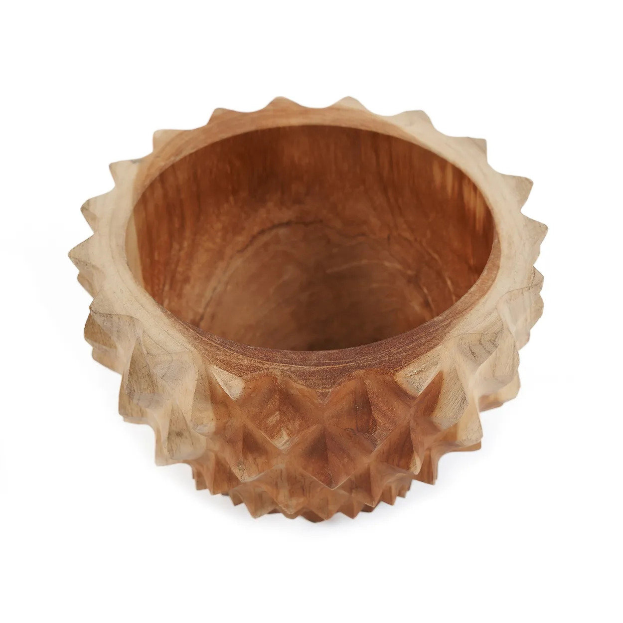 Het ontwerp van deze kom is geïnspireerd op de durianvrucht, die vaak de koning der vruchten wordt genoemd. De buitenkant heeft een gestructureerd oppervlak dat lijkt op de stekelige schil van de durian. Gebruik hem als decoratief middelpunt of als serveerschaal voor fruit, noten of snacks. De diepe, rijke tinten van het teakhout benadrukken duurzaamheid en tijdloosheid, waardoor het een blijvende aanwinst is voor elk huis of elke collectie.