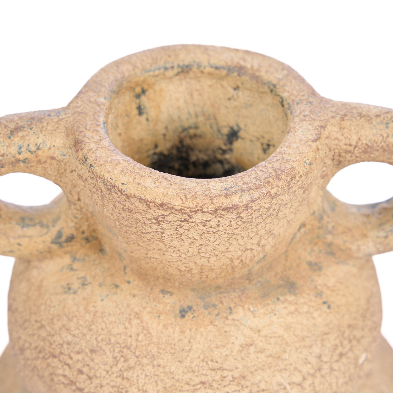 Dit stuk is intiem van formaat en werkt als een kleine terracotta decoratieve vaas, ideaal voor enkele stelen, gedroogde takjes of als sculpturaal accent. De bescheiden proporties maken hem veelzijdig, warm zonder te overheersen. Lichtgewicht maar duurzaam, past hij zich moeiteloos aan in elk interieur.