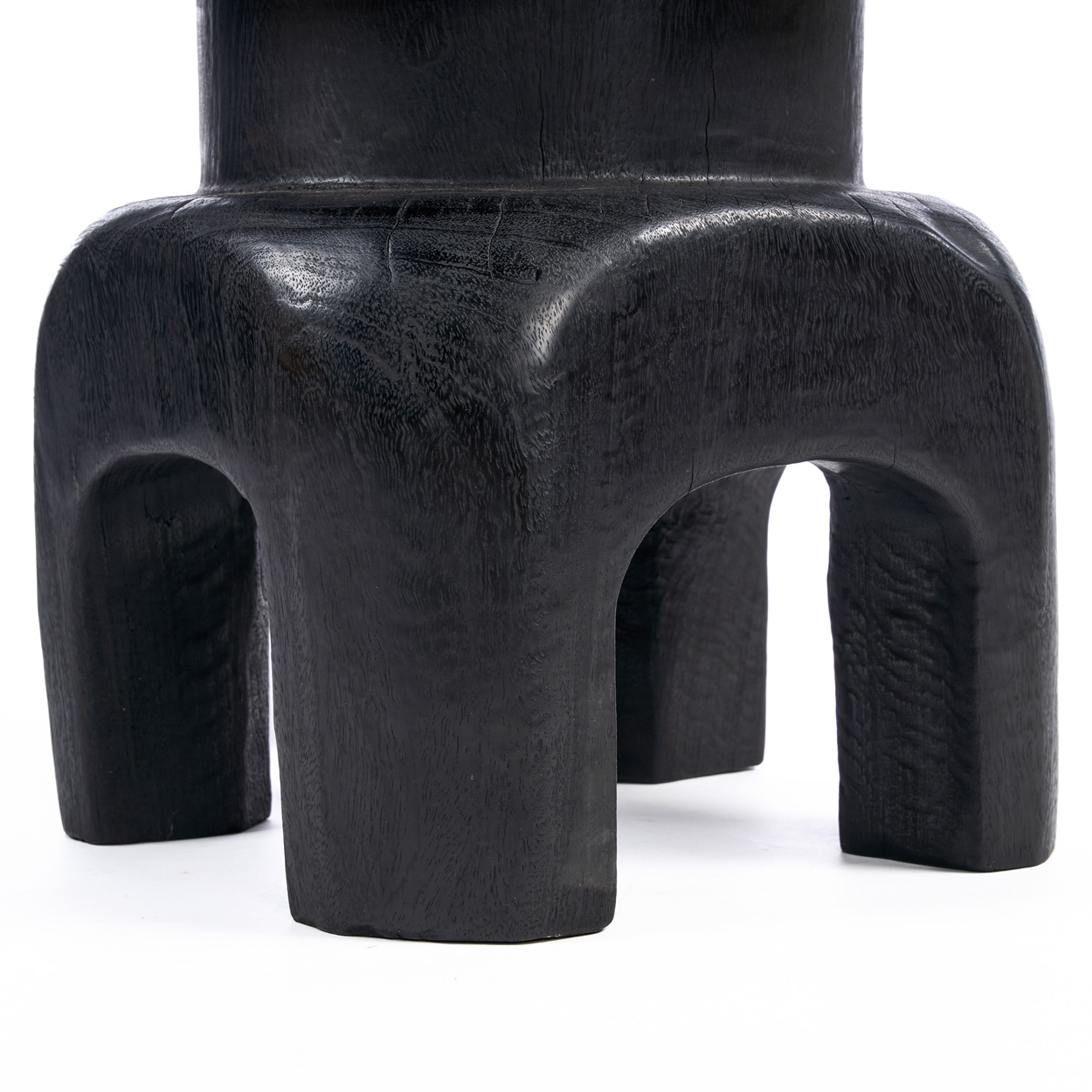 Sculpturaal en compact, deze zwarte houten kruk combineert gedurfde geometrie met zachte tactiliteit. Een stille blikvanger van massief mangohout.